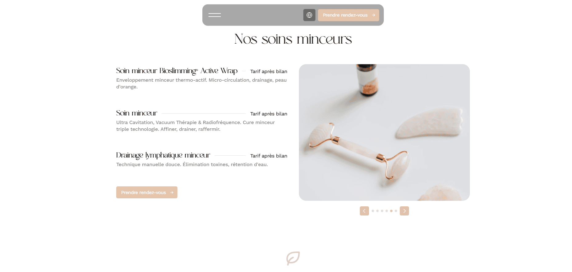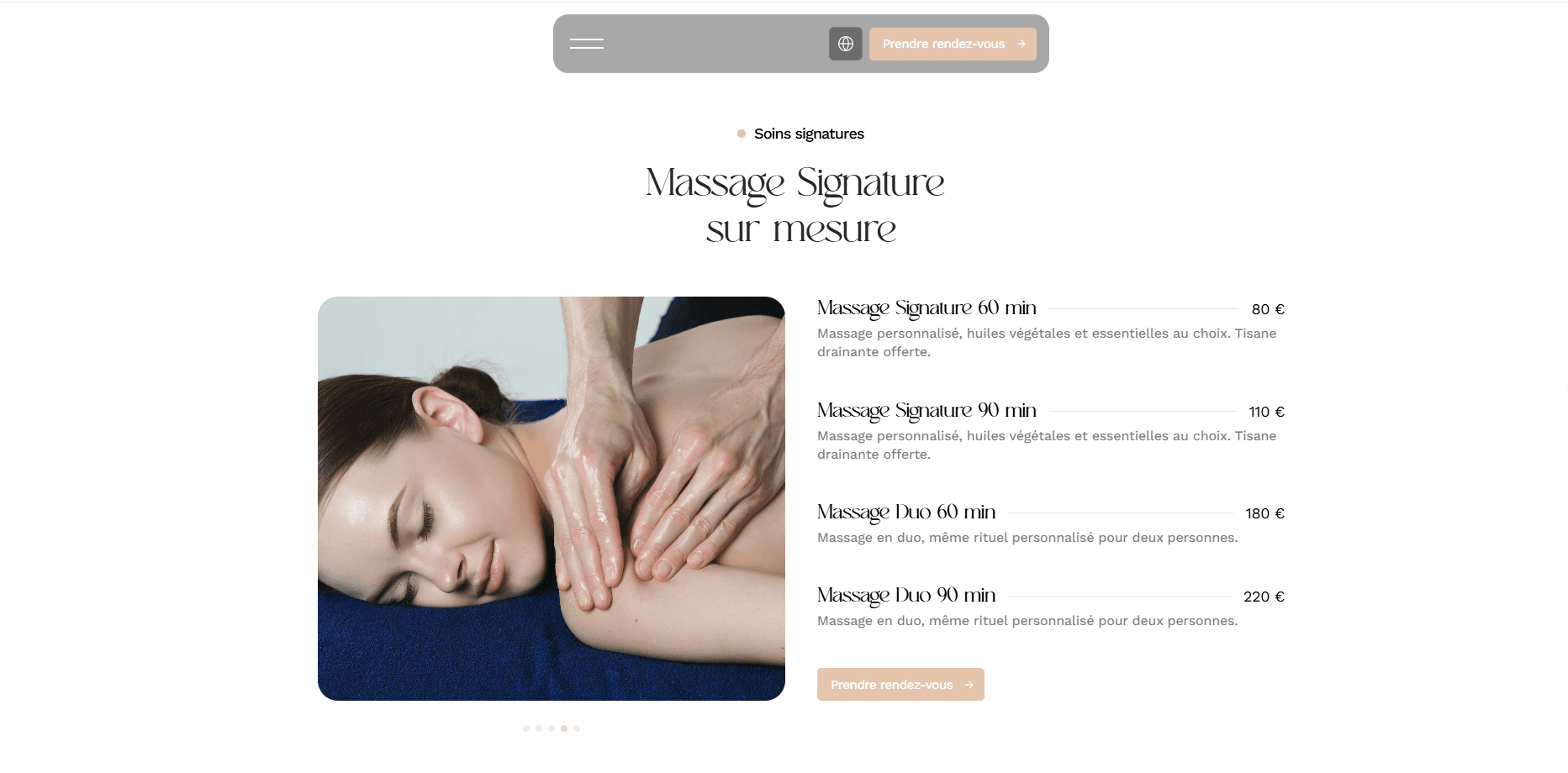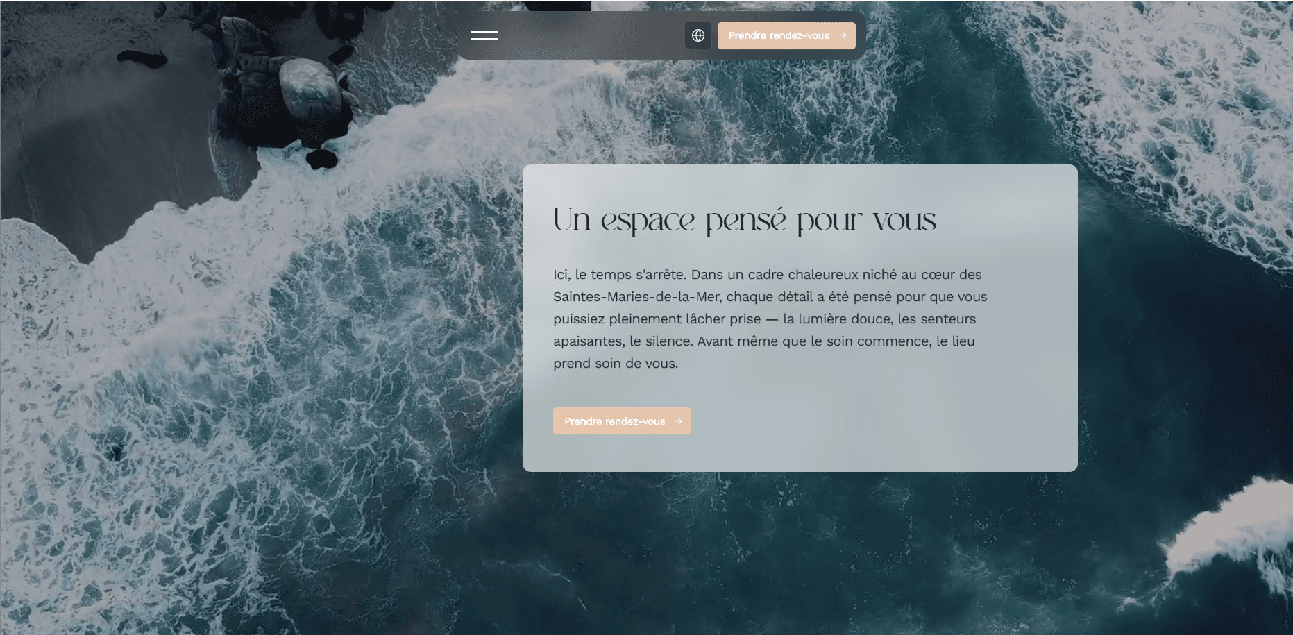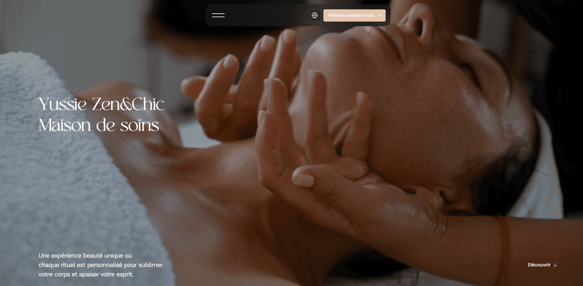 Nous avons conçu un site one-page sur mesure, pensé comme une invitation au lâcher-prise. La direction artistique s'inspire directement de l'atmosphère du salon : tons neutres et apaisants, typographies élégantes, espaces de respiration généreux. Chaque section — soins visage, massages sur mesure, body experiences — dévoile l'offre avec clarté et raffinement. Le parcours utilisateur a été optimisé pour guider naturellement vers la prise de contact, avec un formulaire personnalisé qui permet de définir le rituel idéal avant même la première visite.